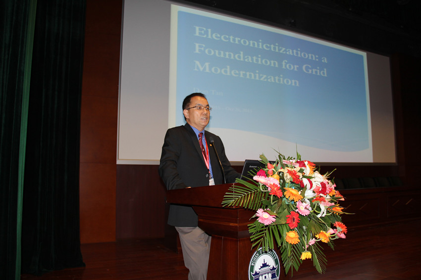 中國電工技術(shù)學(xué)會副理事長兼學(xué)術(shù)委員會主任梁曦東教授主持會議,中國電工技術(shù)學(xué)會副理事長兼秘書長裴相精、武漢大學(xué)黨委副書記駱郁廷分別致歡迎辭。華中科技大學(xué)程時杰院士、IEEE PELS前主席譚方東博士、中國電力科學(xué)研究院配電所盛萬興所長、武漢大學(xué)電氣工程學(xué)院院長唐炬教授和北京科銳配電自動化有限公司袁欽成副總經(jīng)理在主會場作了精彩的特邀報告。