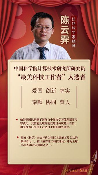 中國科學院計算技術研究所研究員,“最美科技工作者”入選者!他帶領團隊研制了國際首個深度學習處理器芯片寒武紀,其智能處理的能效超過傳統芯片百倍,相關技術已實用于近億臺手機和服務器中。他被《科學》雜志評價為國際上智能芯片公認的領導者之一,被《麻省理工科技評論》評為全球35位杰出青年創新者之一。