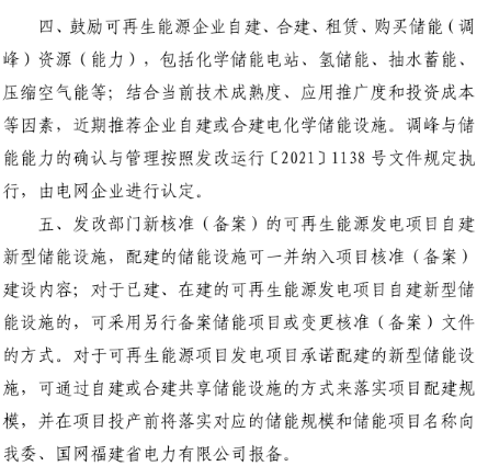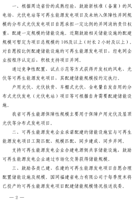 《通知》指出,鼓勵新核準(備案)的風電場、光伏電站等可再生能源發電項目及未納入保障性并網規模的分布式光伏發電項目自愿承擔一定比例的并網消納責任權重,配建一定規模的儲能設施。近期鼓勵相關儲能設施的配建規模可暫定為項目總規模的10%及以上(時長2小時及以上)。對自愿按比例配建儲能設施的可再生能源發電項目,經電網企業按程序認定后,積極支持項目并網。通過競爭性配置、試點示范等方式獲得開發權的風電、光伏等可再生能源發電項目,其配建儲能規模按約定執行。